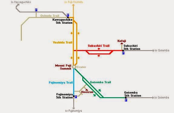 La temporada oficial d’ascens al Fuji comença del 10 de Juliol al 10 de Setembre. S’ha de tenir en compte aquestes dates, ja que més enllà, no operen els autobusos a les quintes estacions inter-mitges i diferents refugis de muntanya tanquen. Us podríeu quedar literalment “penjats”. El mont Fuji consta de 4 “Trails” que varien en latitud i dificultat d’ascens i descens: ( En ordre de menor a major dificultat )