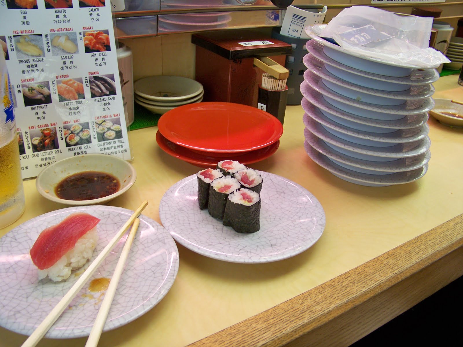 També hi ha restaurants de Sushi amb una cinta giratòria, en la que al mig hi han els cuiners que van fent sobre comanda i els van servin amb platets, al final pagues per la quantitat de plats consumits, en aquestos no et porten l’aigua fresca, davant tens una aixeta amb aigua calenta i sobres de te verd (gratuït). Pots sopar bé per 15 Euros. (sense cervesa)