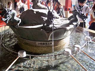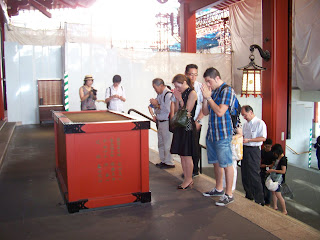 Allí hem pregat una mica per tots, ens hem perfumat amb una foguera d’incens i netejat les mans en la font del drac. Tot seguit hem anat a guirijexar la zona per les botiguetes de records del voltant on hem menjat dolços japonesos de xocolata amb plàtan en forma de peix (Boníssims!). Seguidament hem passejat pels ponts que sobrevolen el riu Sumida -gawa, per acabar sopant en un restaurant una mica de sushi fresc!!!